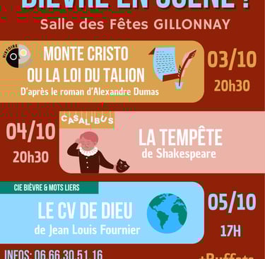 Format : 3 spectacles, un vendredi soir, un samedi soir et un dimanche en matinée et d'autres festivités lors de cette journée portes ouvertes de la Cie Bièvre & mots Liers